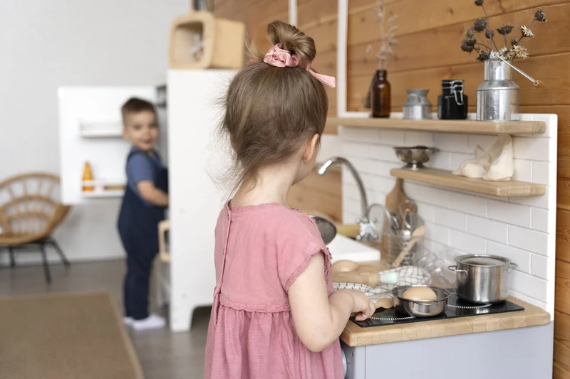 Малыши играют на детской кухне.